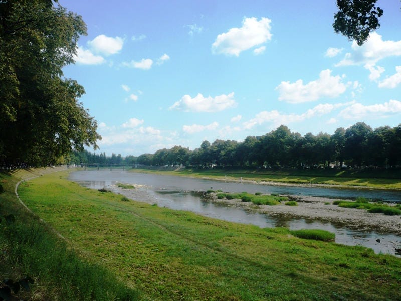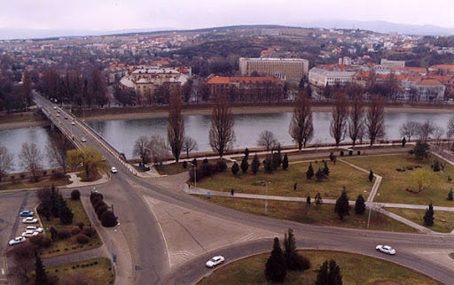 They drained the second river, built the dams, and invested significantly in new housing and districts. The architecture can be identified by more Art Deco style architecture than the Austro-Hungarian style, such as these buildings. The Czechoslovaks were also the first to build a university here, but then the Hungarians destroyed it, and the Soviets rebuilt.